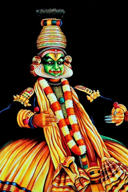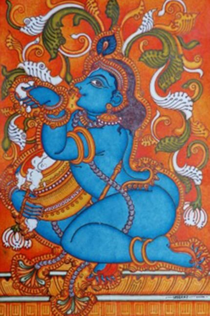 B VM102 captures a celestial gathering of Hindu deities including Shiva-Parvati, Ganesha, Krishna, and others in vivid Kerala mural tradition. Rich in symbolism and detail, this artwork embodies divine unity and cosmic balance, making it a spiritually uplifting centerpiece for homes, temples, or sacred art collections.
