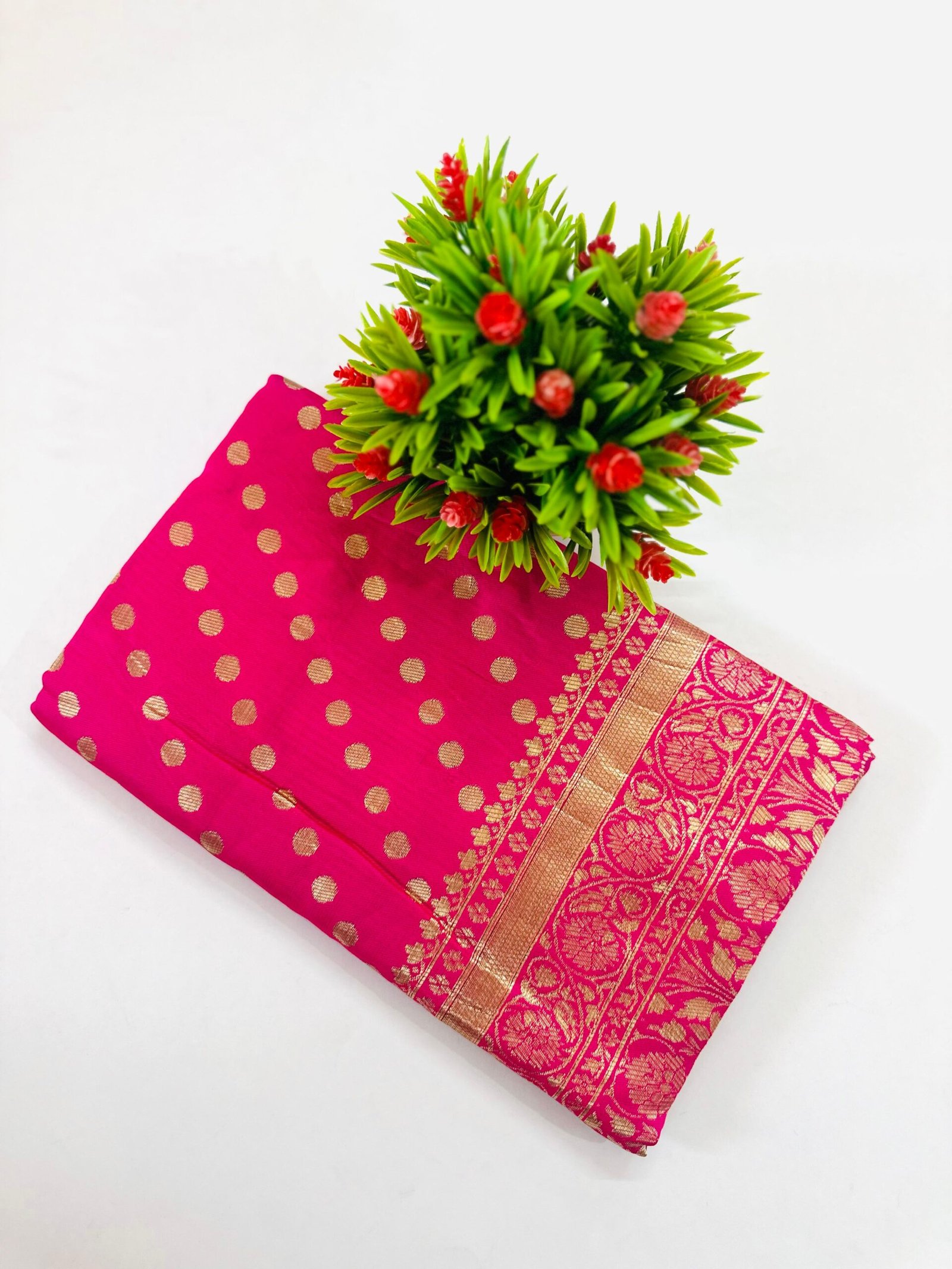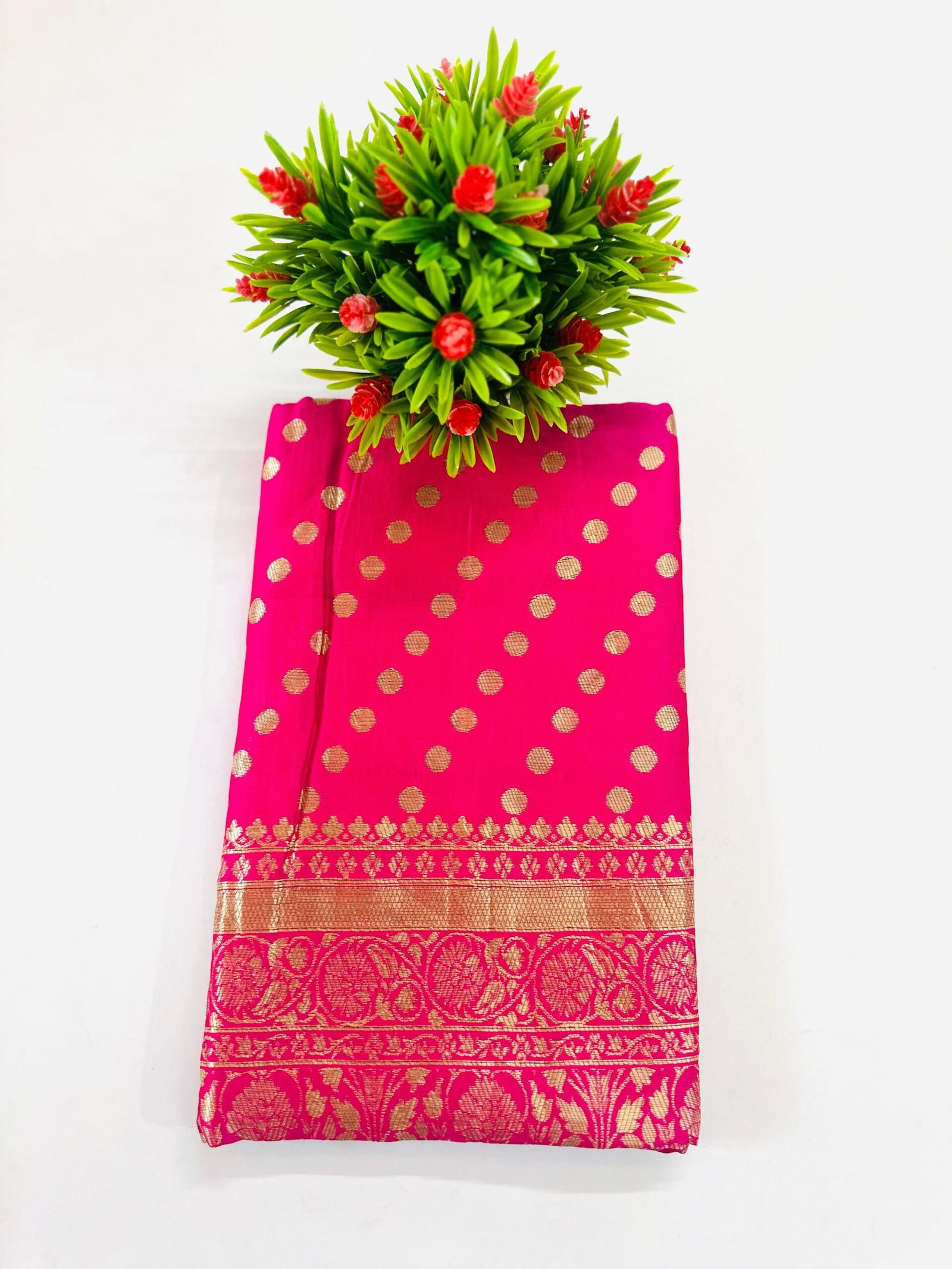 - Color & Pattern:it is a Rose/rani pink Saree with gold Dot/Butti Pattern and an Ornate Gold Zari Border.