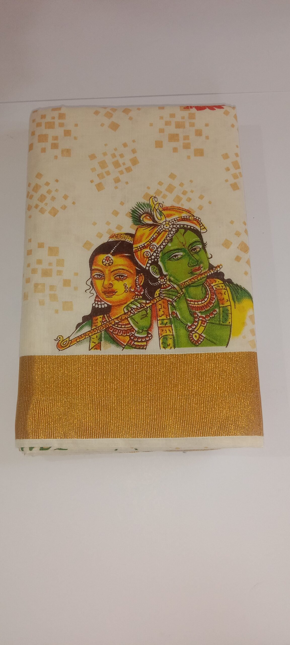 Kerala Handloom Cotton Saree With Krishnan Radha Print Design And Golden Border.