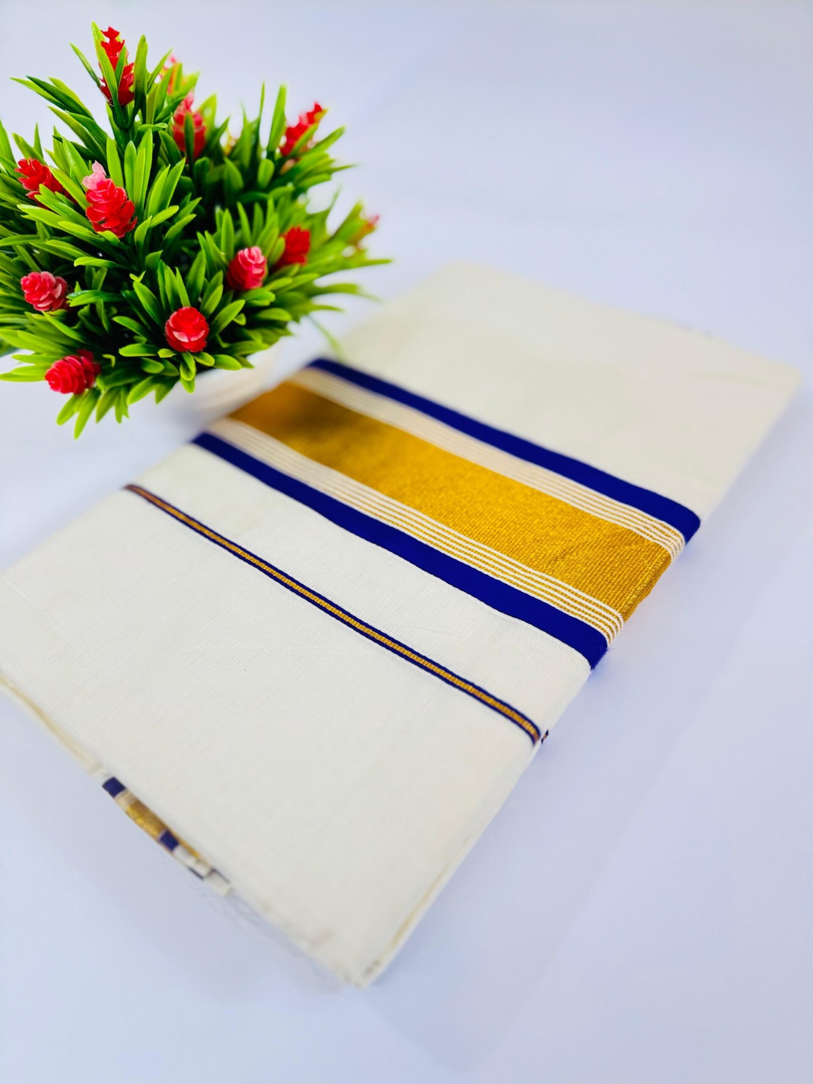 Celebrate tradition with elegance in this exquisite handloom cotton saree, designed for the discerning woman. Crafted from pure cotton, this traditional Kerala attire features a classic off-white body, accentuated by a Plain body with Blue & Gold/maroon  & gold /green & gold / purple & gold borders . The Kerala Handloom Saree is a cherished representation of Kerala’s cultural legacy, and the set completes the look with grace and authenticity.