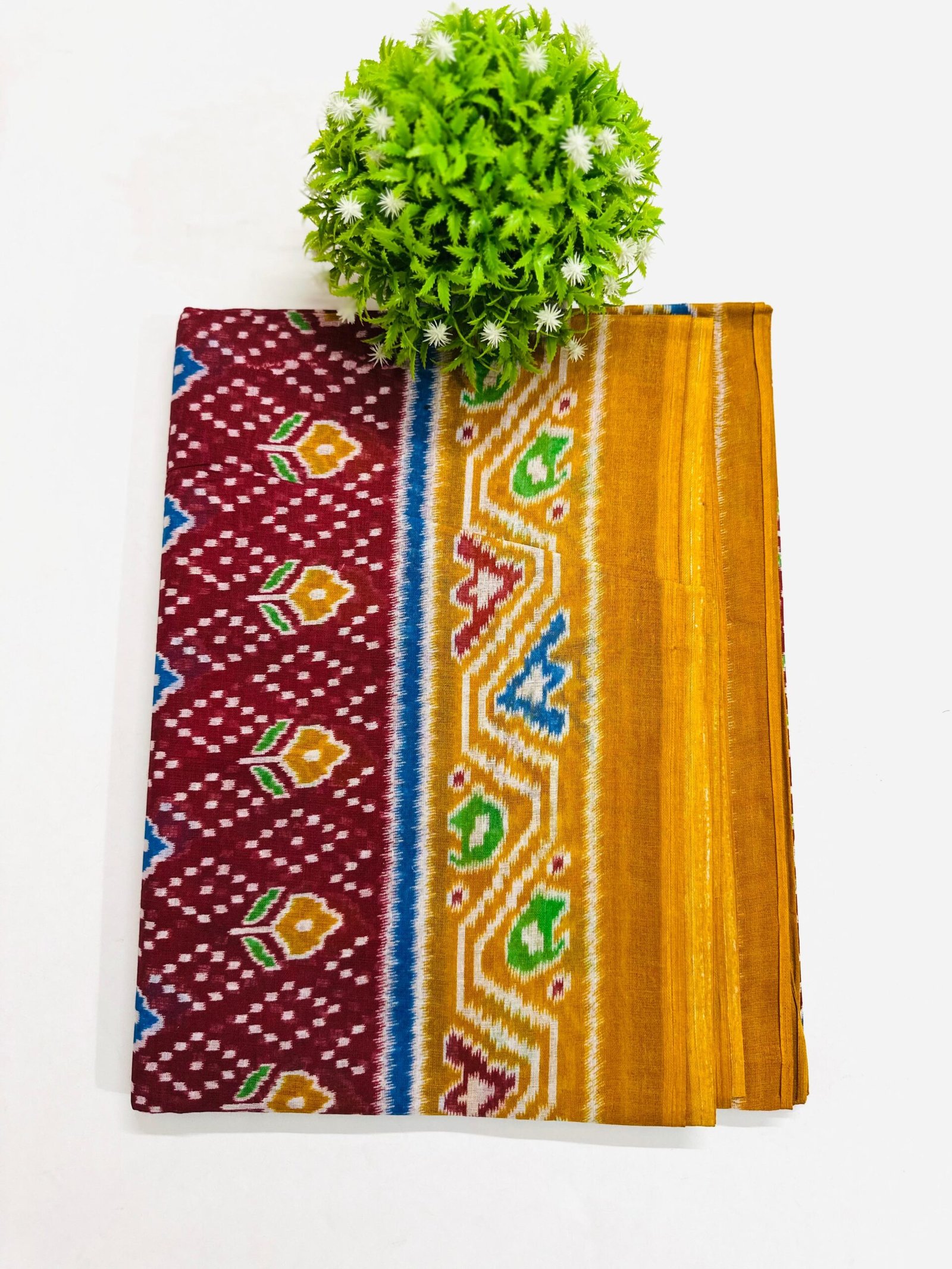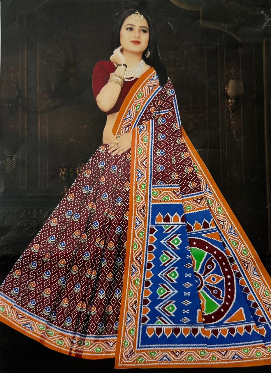 • Color & Pattern:This is a striking panchali cotton saree featuring a rich maroon body with all-over geometric diamond patterns. The most distinctive elements are the wide border and pallu, framed in bright orange and patterned with bold royal blue and multi-colored traditional motifs. The overall look is vibrant, elaborate, and perfect for festive occasions.