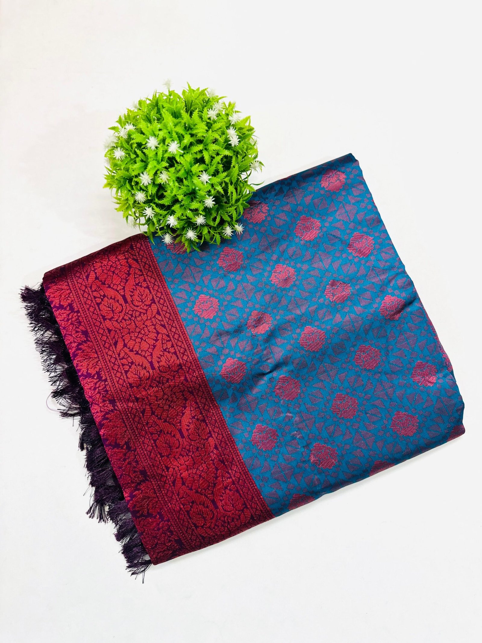 Color & Pattern: A Teal/Peacock Blue saree with an all-over Maroon brocade body, contrasted by a wide, solid Maroon woven pallu.