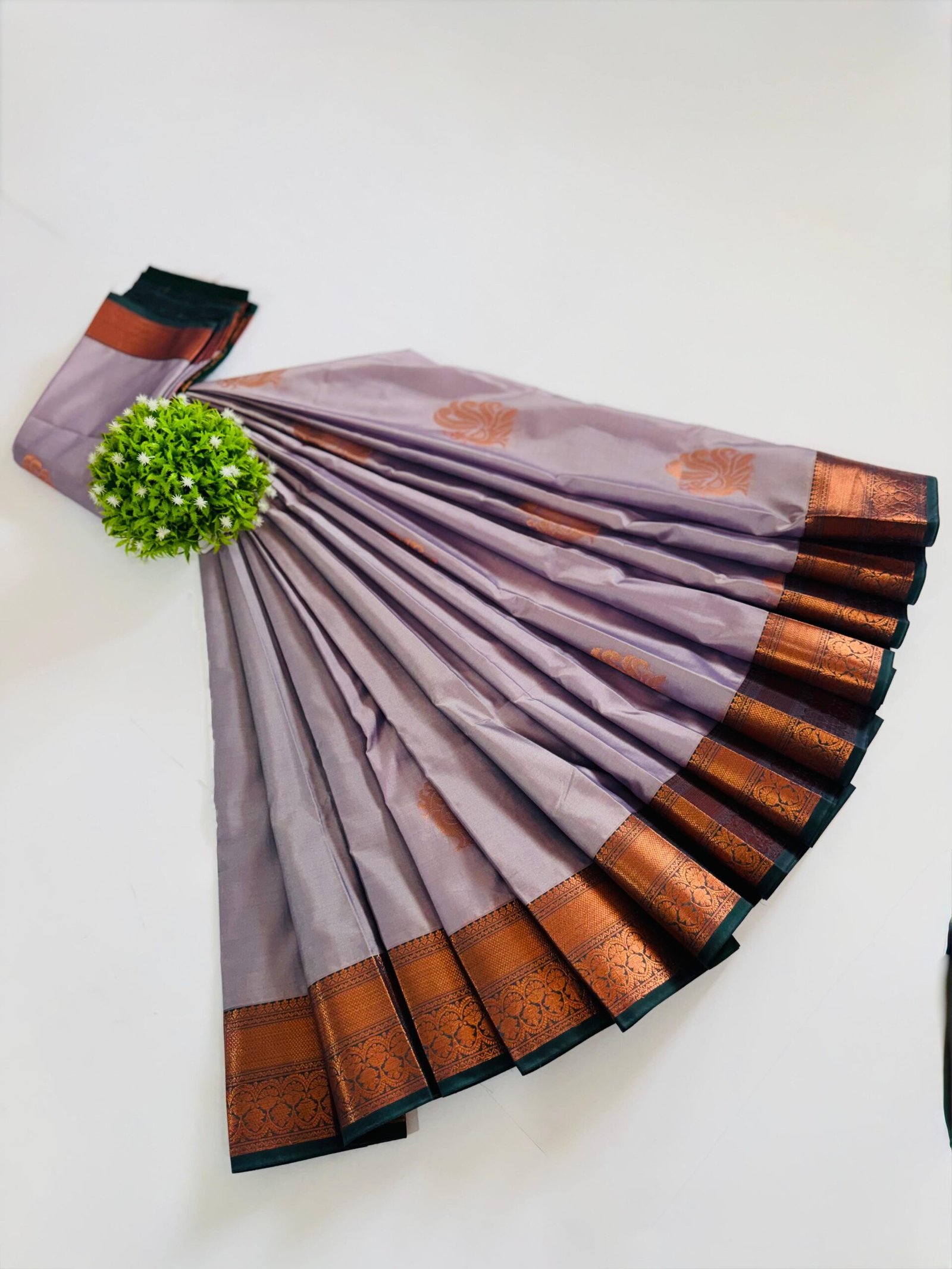 - Color: A trending and exquisite Muted Lavender/Grey body with warm, contrasting Copper-Bronze Zari on the border and pallu.