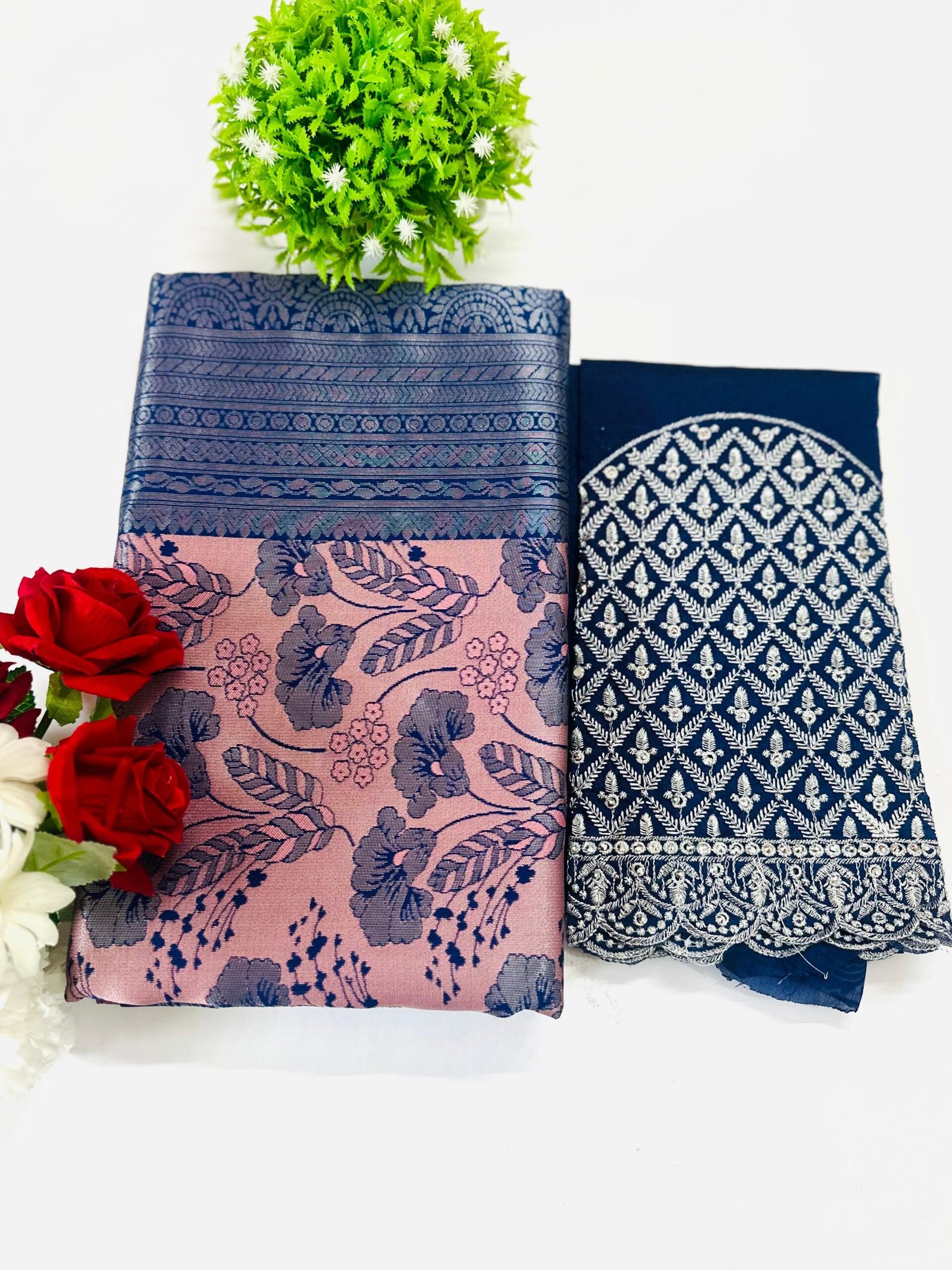 - Color & Pattern:This saree is defined by its dramatic color contrast and rich brocade weave. The body is a soft dusty mauve/pink with large, woven floral and leaf motifs in deep navy blue. This dark color is used for the striking border and pallu, which are heavily patterned with dense traditional ornamental designs.