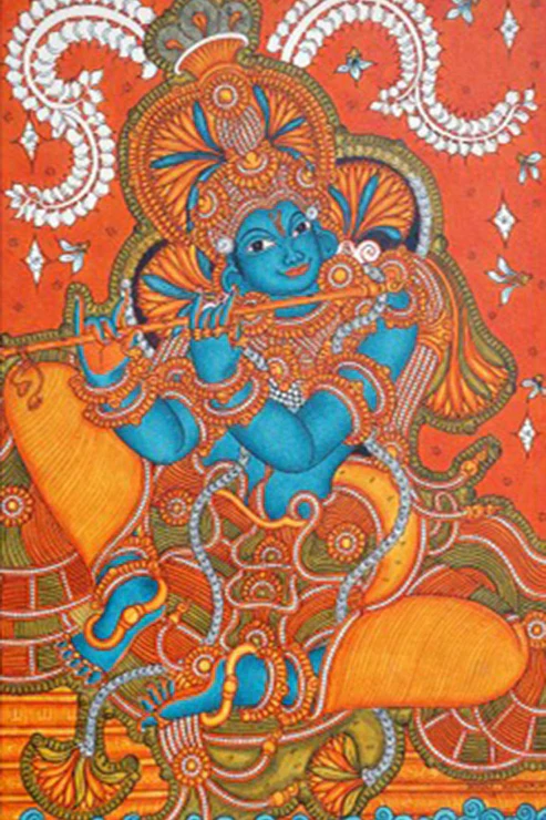B V M109 portrays Krishna serenely playing his flute, adorned in vibrant traditional Kerala mural style. His tranquil blue form is surrounded by intricate motifs and bright orange hues, evoking divine melody and charm. This artwork symbolizes peace, love, and spiritual harmony, perfect for enhancing devotional and artistic spaces alike.