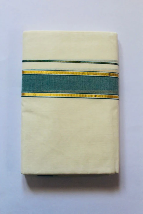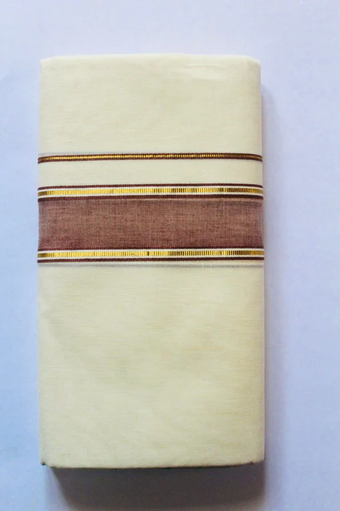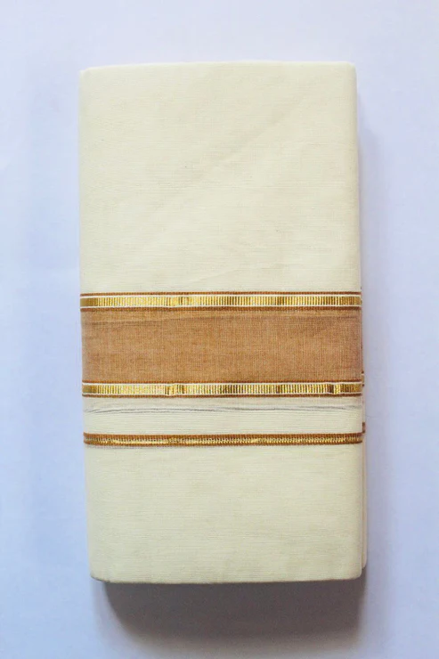 Celebrate tradition with elegance in this exquisite handloom double mundu designed for the discerning . Crafted from pure cotton, this traditional Kerala attire features a classic off-white body, accentuated by a  border. The double Mundu style is a cherished representation of Kerala’s cultural legacy, and the set completes the look with grace and authenticity.