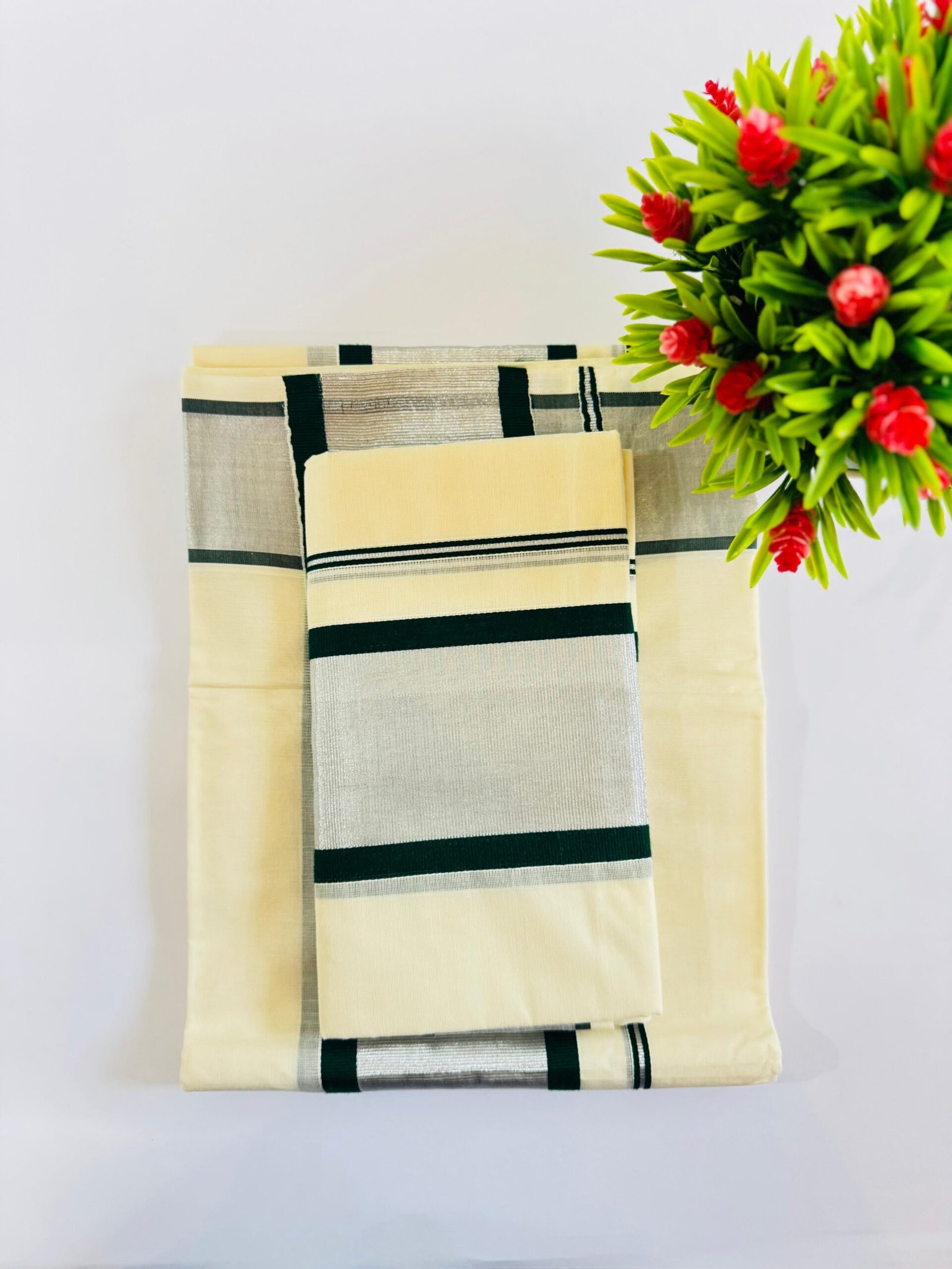 Kerala Cotton Handloom Single Set Mund with Silver and green border