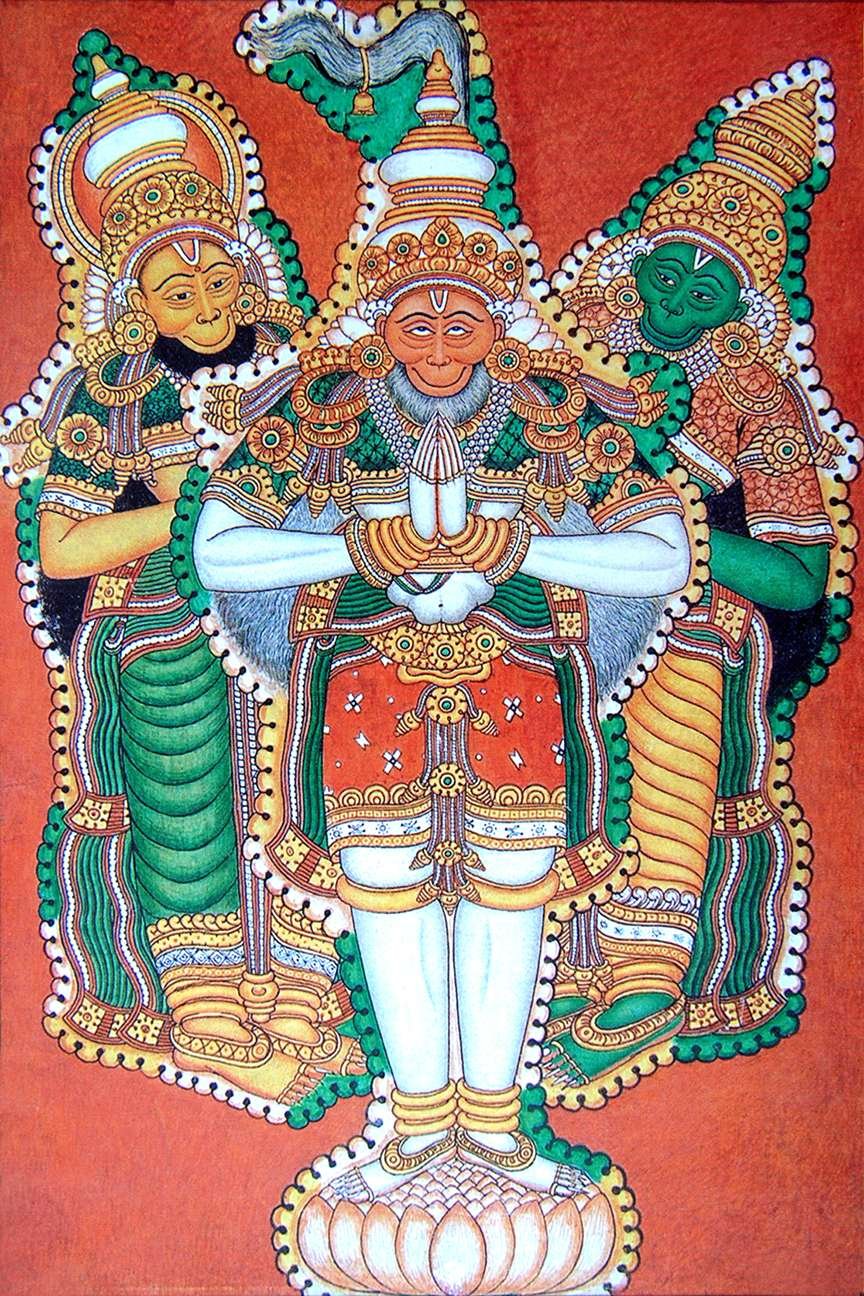 Kerala mural painting of Lord Hanuman in divine form. Depicted with folded hands in devotion, the artwork is adorned with vibrant green, orange, and golden tones, showcasing traditional Kerala mural artistry and spiritual symbolism. in divine form. Depicted with folded hands in devotion, the artwork is adorned with vibrant green, orange, and golden tones, showcasing traditional Kerala mural artistry and spiritual symbolism.
