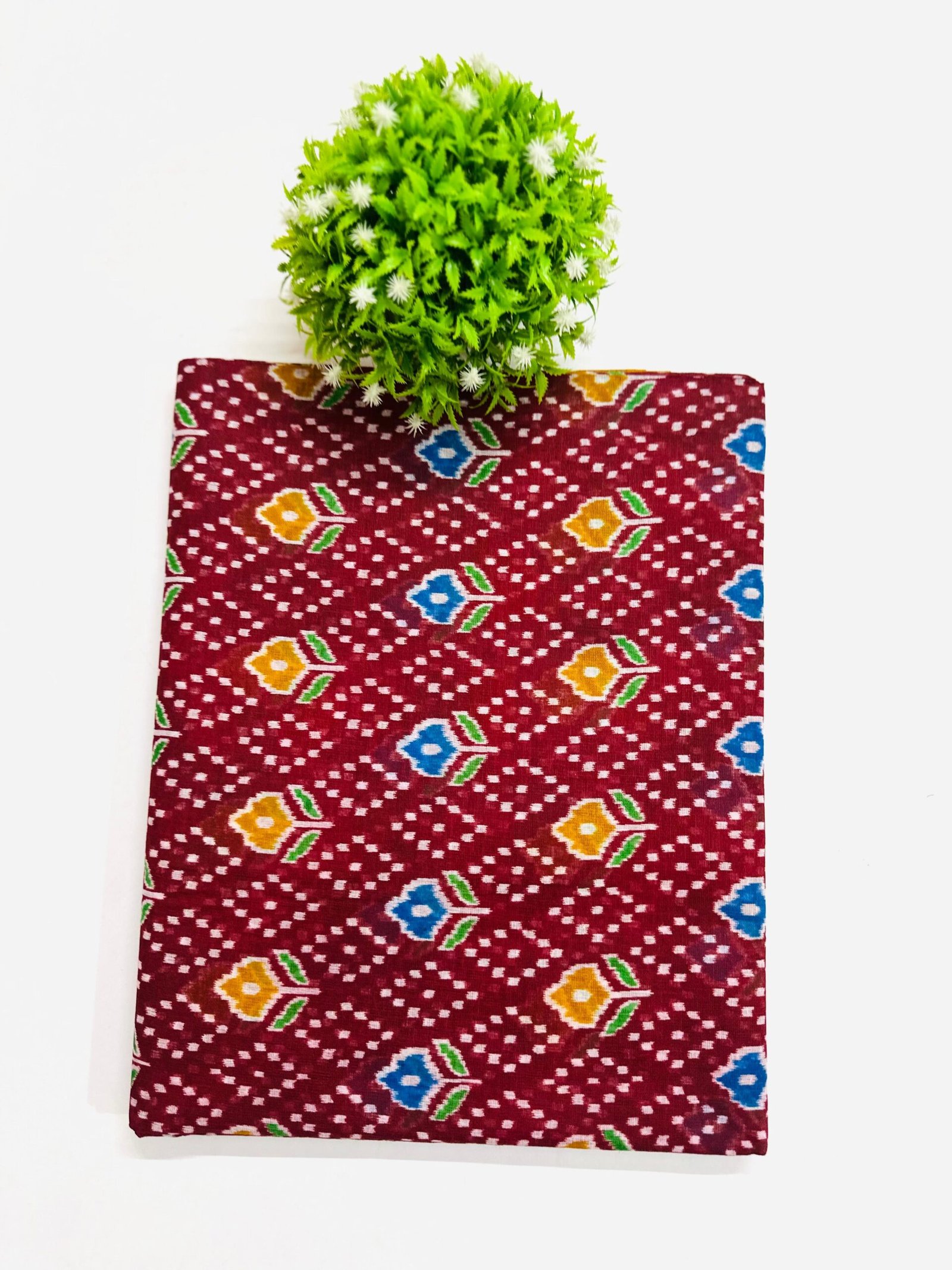 • Color & Pattern:This is a striking panchali cotton saree featuring a rich maroon body with all-over geometric diamond patterns. The most distinctive elements are the wide border and pallu, framed in bright orange and patterned with bold royal blue and multi-colored traditional motifs. The overall look is vibrant, elaborate, and perfect for festive occasions.