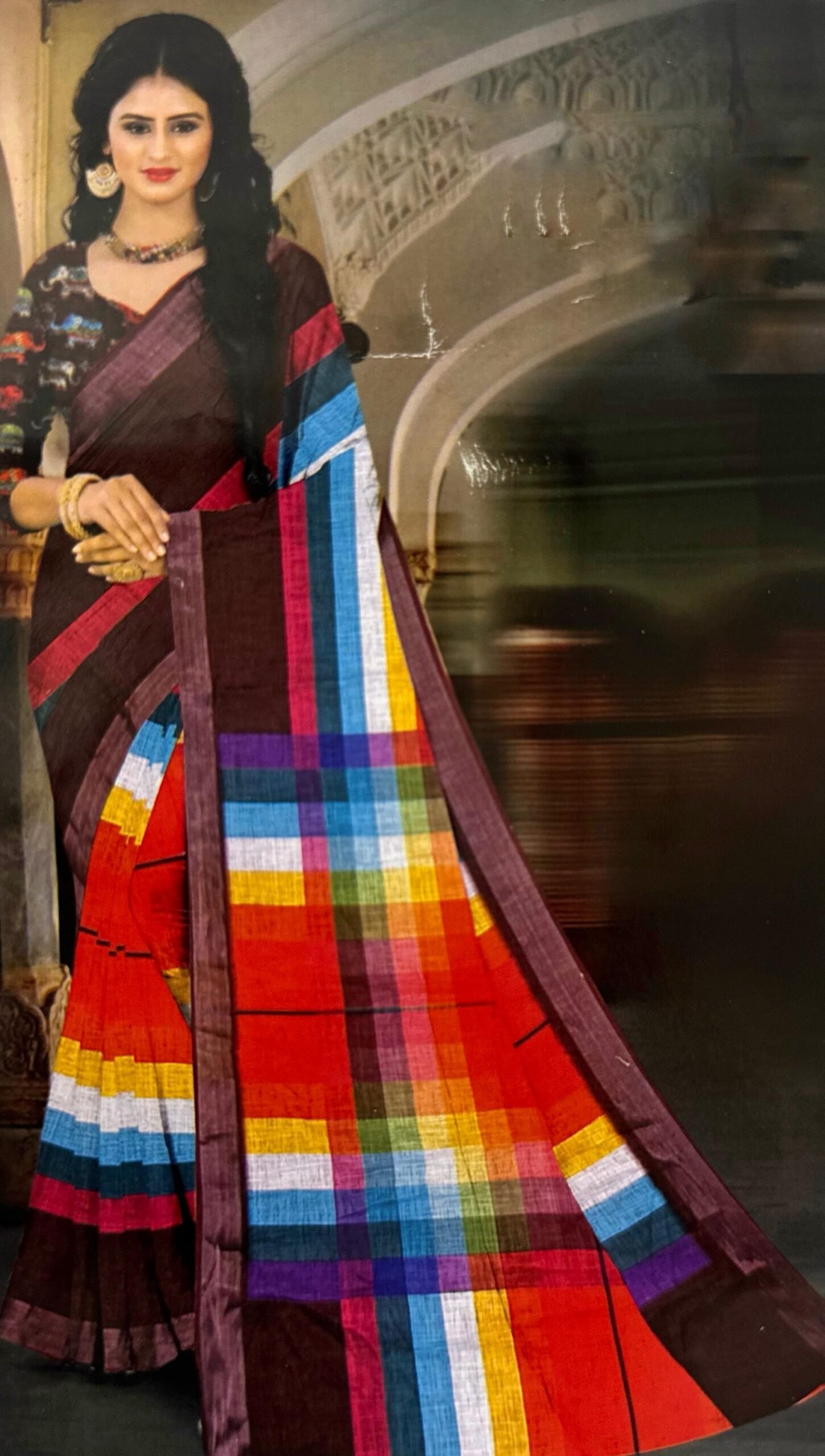 - Color & Pattern:The saree features a solid brown base contrasted with a bold, multicolor checkered/plaid pattern on the pallu. The checks use vibrant colors like red, blue, yellow, turquoise, and fuchsia.