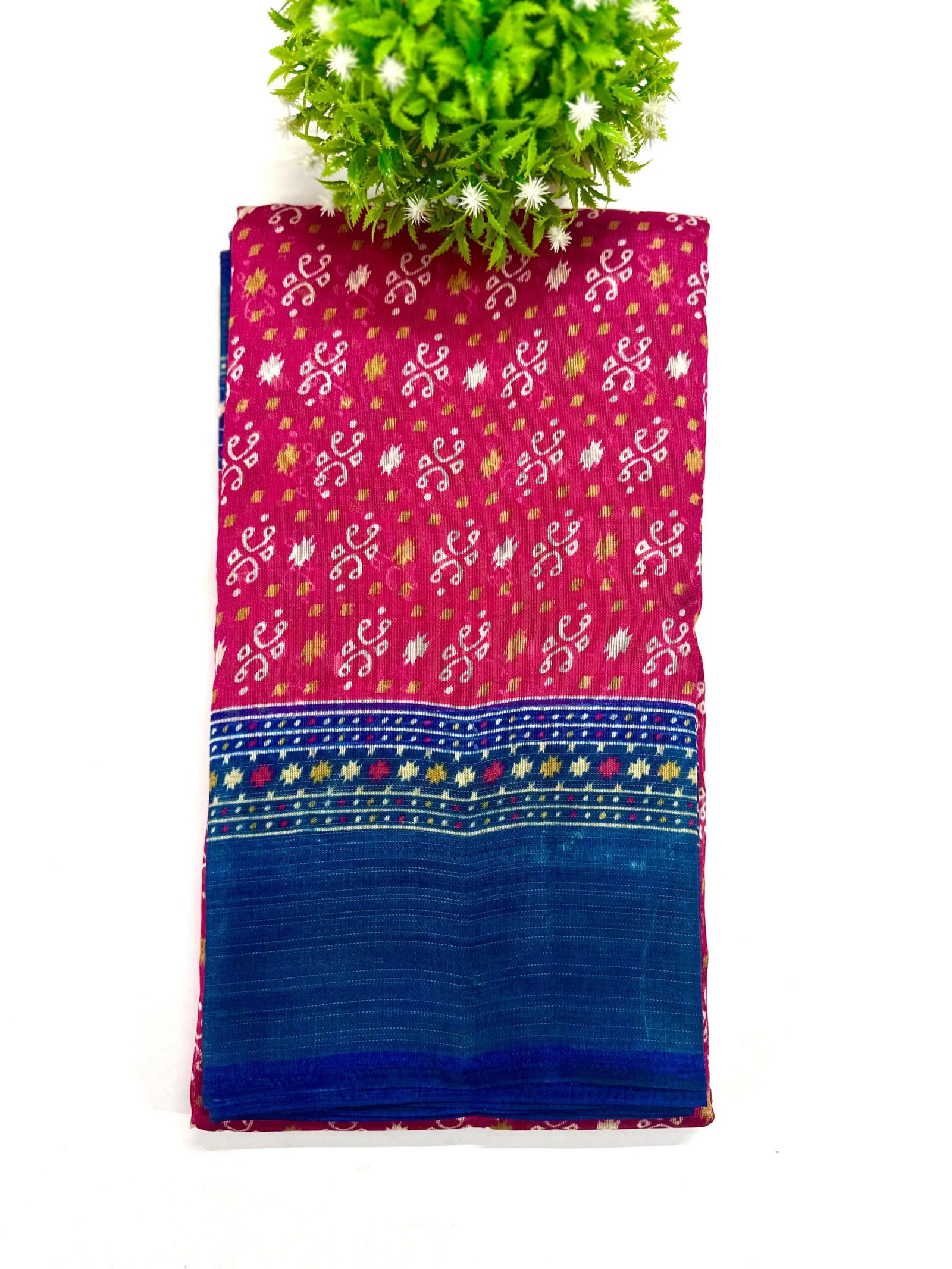 Color & Pattern:.This is a vibrant Deep rose for the main body and blue for the border. . featuring a traditional geometric ikat-style print across the body and a contrasting patterned border and pallu.